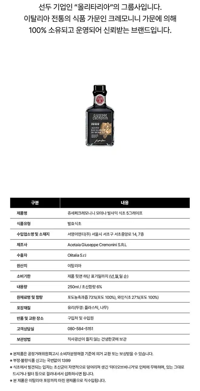 품명 : 쥬세페크레모니니 모데나 발사믹식초 5그레이프