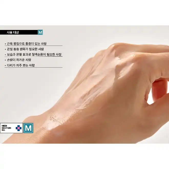 - 사용 추천대상 : 근육 뭉침으로 통증이 있는 사람, 관절 통증 완화가 필요한 사람, 보습과 온열효과로 혈액순환이 필요한 사람, 손발이 차가운 사람, 다리가 자주 붓는 사람